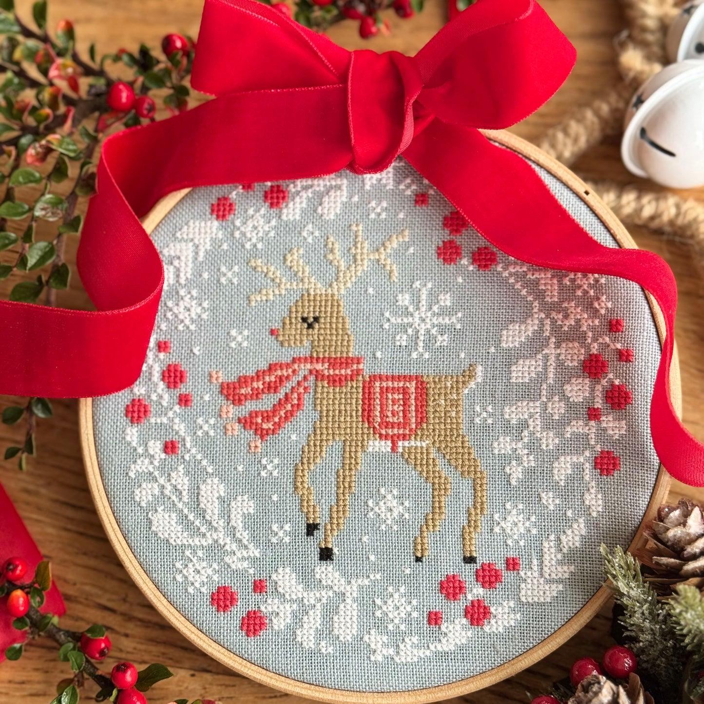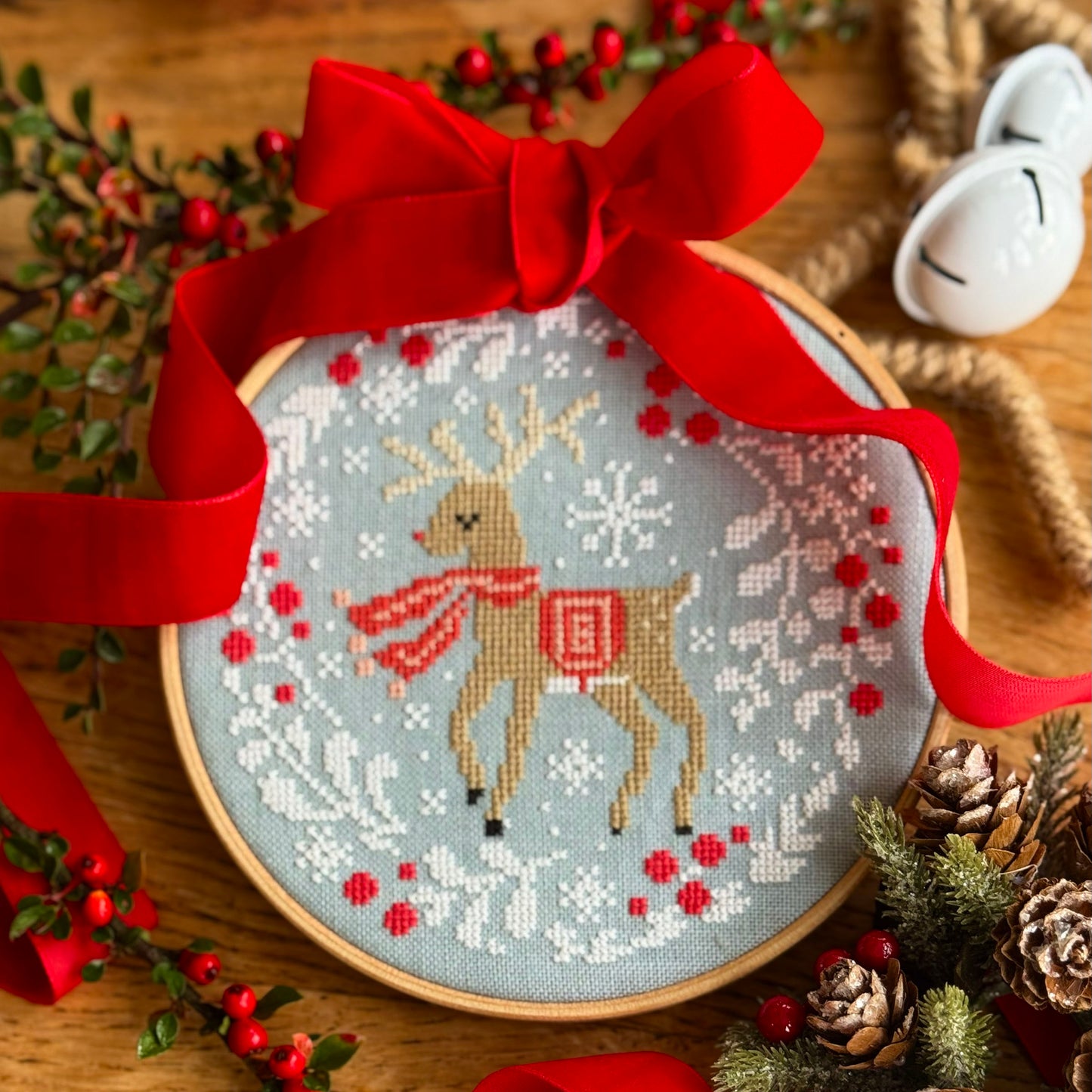 We are excited to bring you the secibd of our Christmas designs for 2025. Stitched on power blue fabric from Zweigart, the design features a Festive Reindeer surrounded by white foliage, snow flakes and stars.
